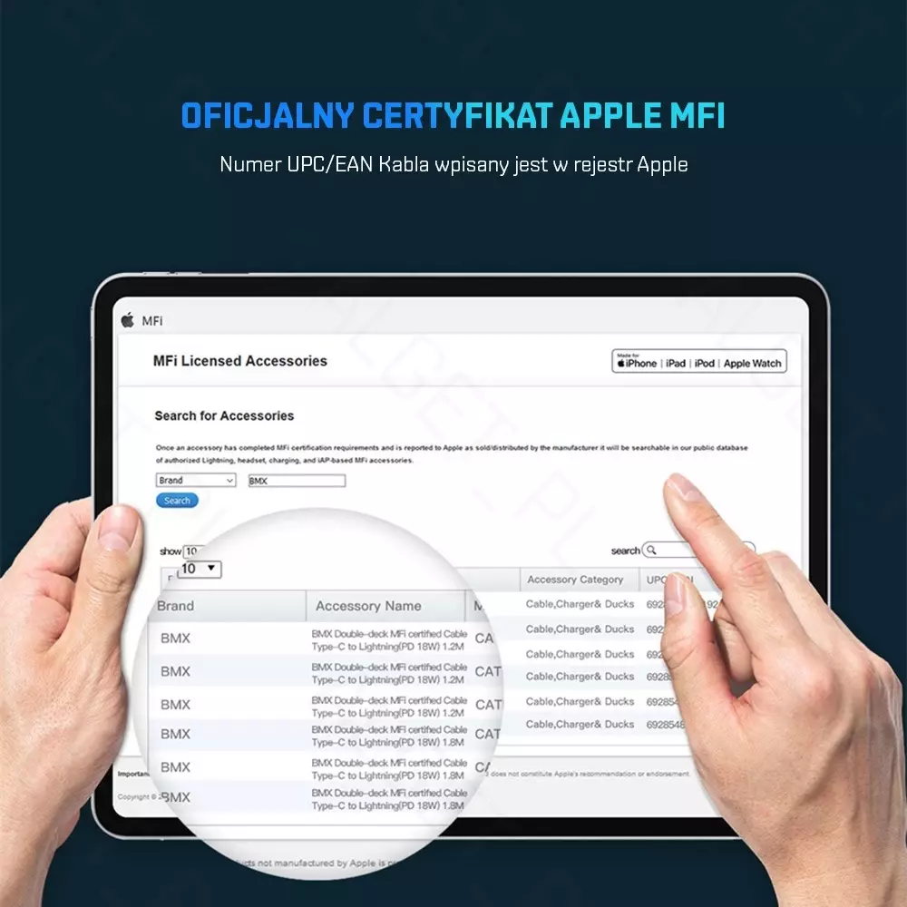 Kabel BASEUS BMX USB-C - Lightningist ein Kabel für Geräte mit Lightning-Anschluss. Dank ihm können Sie Daten schnell übertragen und dank der Leistung von 18 W und der Unterstützung der Power Delivery (PD)-Technologie können Sie Ihre Geräte schnell aufladen. Es verfügt über 8p- und USB-C-Stecker, die sich in speziell profilierten und verstärkten Gehäusen befinden, die für Sicherheit sorgen und eine langfristige Nutzung garantieren. Das Kabel ist von Apple offiziell MFi-zertifiziert. Dies ist sehr wichtig, da Sie sich zu 100 % darauf verlassen können, dass es mit Ihrem Gerät kompatibel ist. Darüber hinaus passt der eingebaute intelligente Chip die optimale Intensität für das zu ladende Gerät an und erhöht gleichzeitig die Ladeeffizienz und die Sicherheit des Akkus. Eingewickelt in einen speziellen Klettverschluss für einfachen Transport - kein Kabelsalat mehr! Ein 120 cm langes Kabel arbeitet mit einem maximalen Strom von 2,4 A.