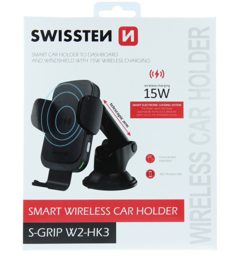 Swissten S-Grip W2-HK3 to uchwyt samochodowy montowany do deski lub szyby z bezprzewodowym ładowaniem 15W.